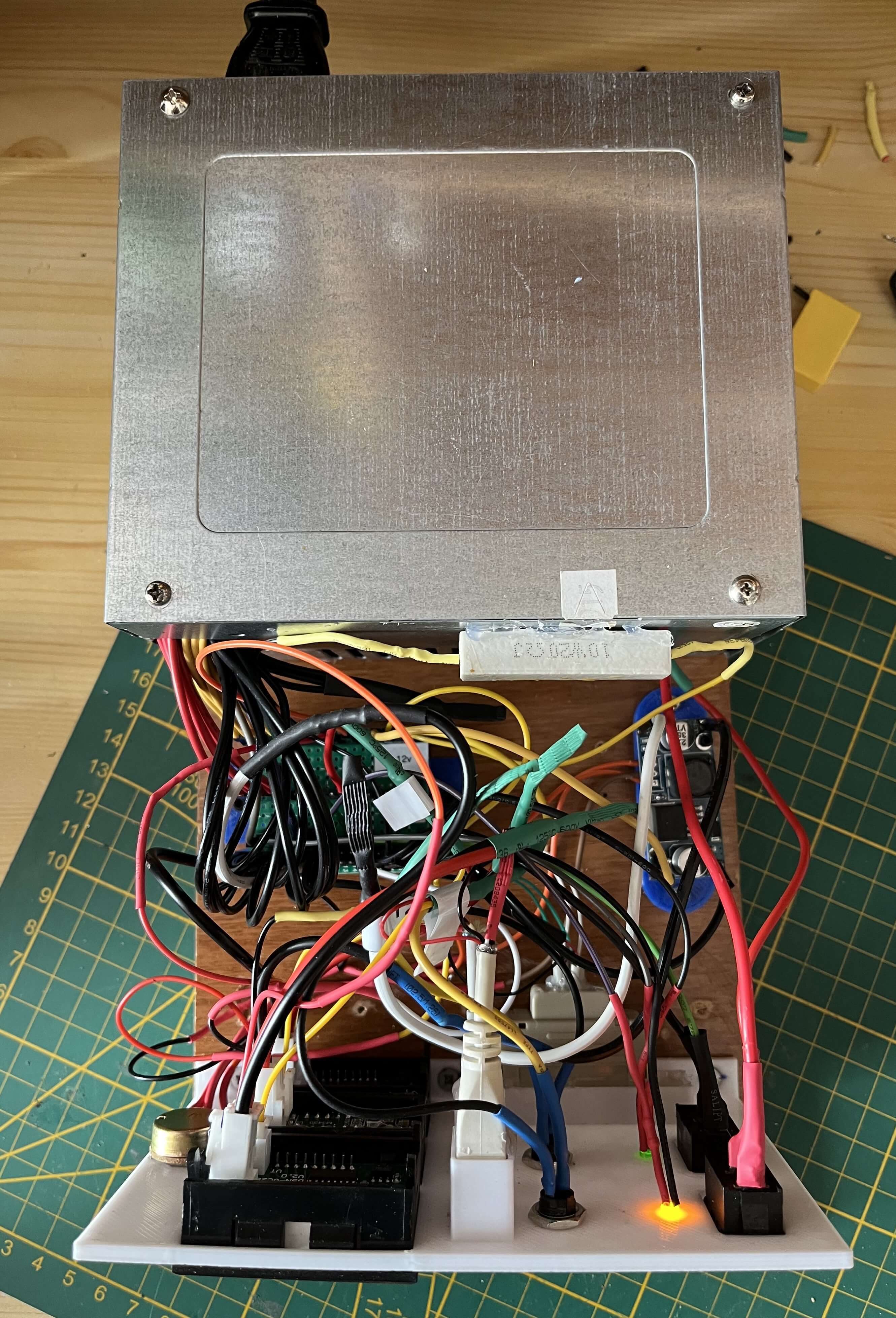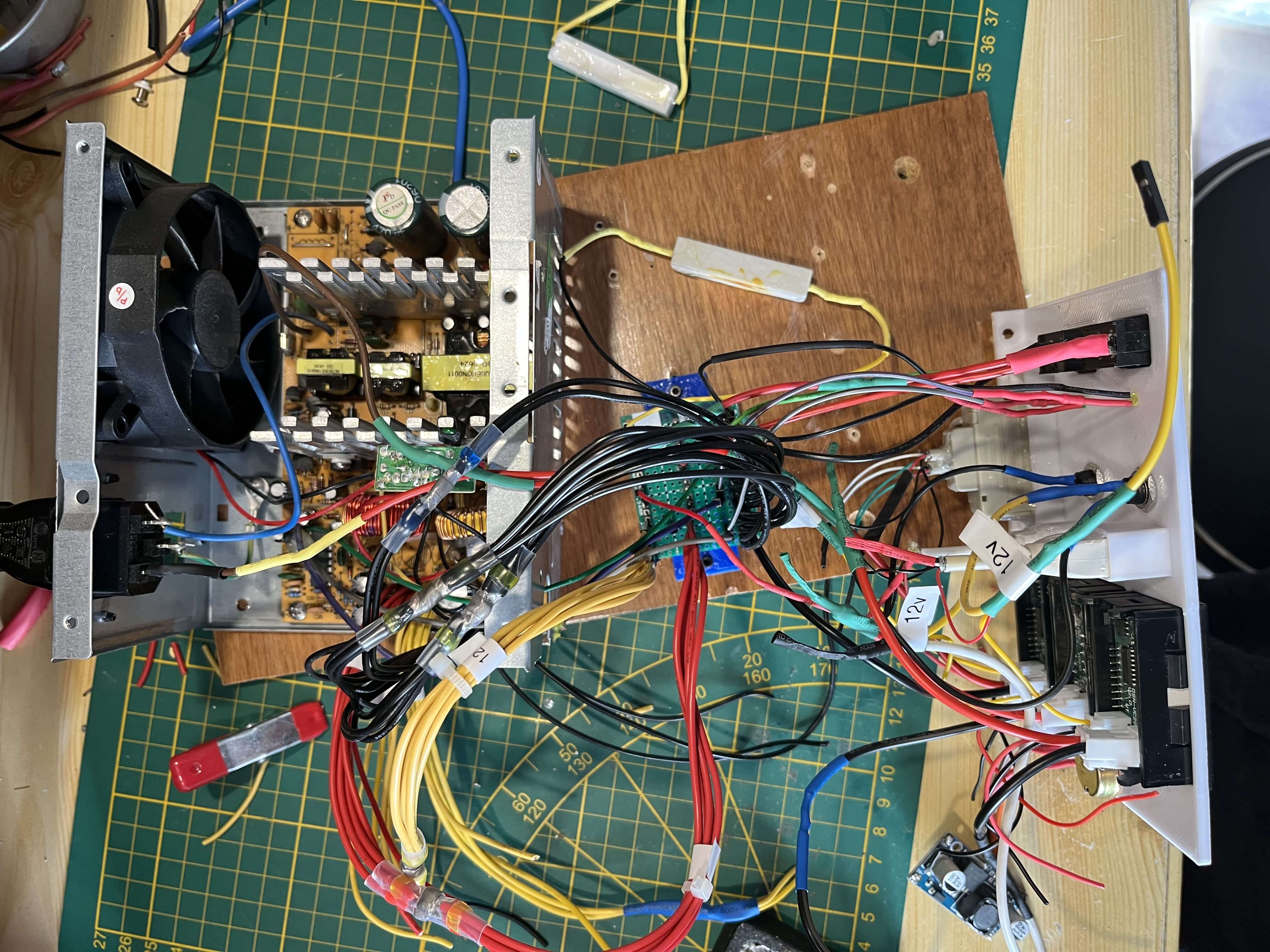Si votre alimentation est récente, il faudra probablement connecter d’autres câbles pour éviter que l’alimentation ne s’éteigne à la moindre charge. Pour mon projet, j’ai également mis une résistance cémentée entre le fil noir et le fil jaune (12v).