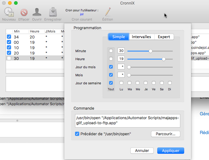 - "Cron pour l'utilisateur" : indique à qui appartient le crontab (ici, le mien, jol).