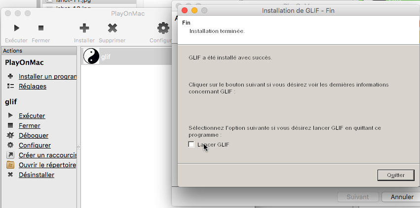 A la fin de l'installation, ne pas cocher la case pour lancer Glif, cliquer sur "quitter"