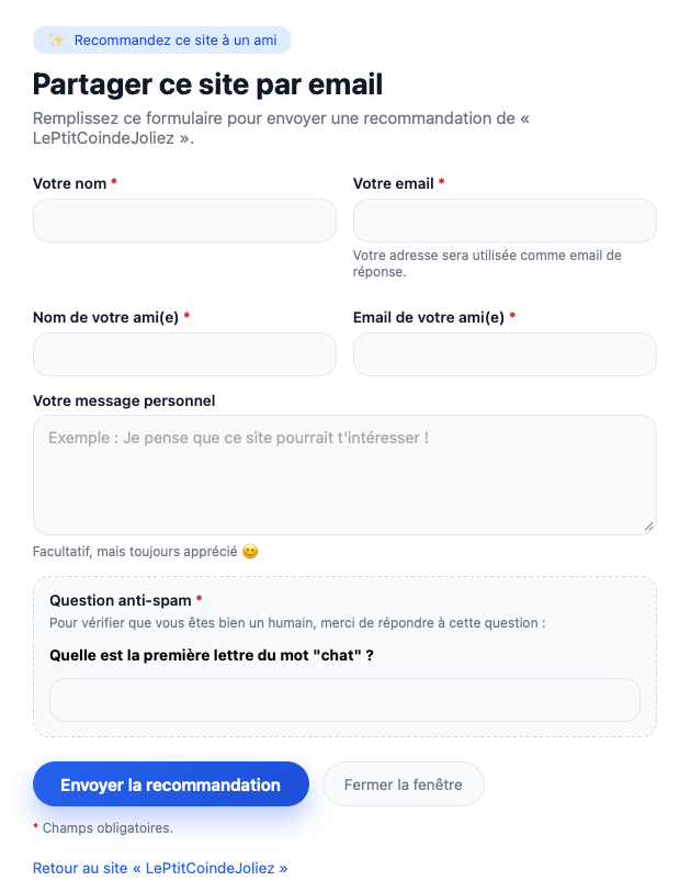 Ce script va vous permettre d'intégrer dans votre site, en toute simplicité, un lien vers un formulaire pour vos internautes "Recommander ce site".